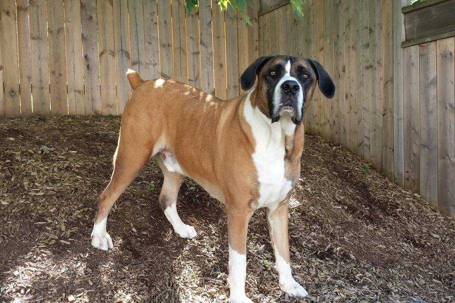 Un Boerboel sur un sol recouvert de copeaux de bois