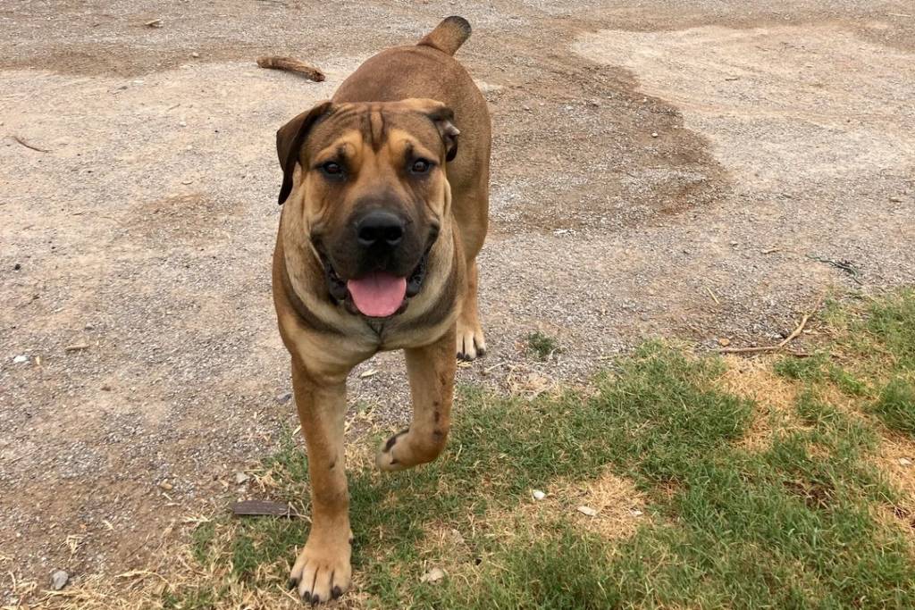 Un Boerboel marchant sur une surface herbacée et tirant la langue