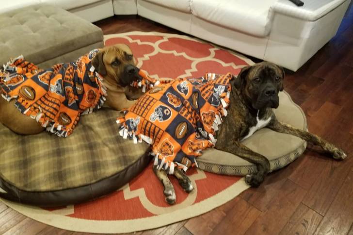 Deux Boerboel allongés sur un tapis et recouvert d'une couverture