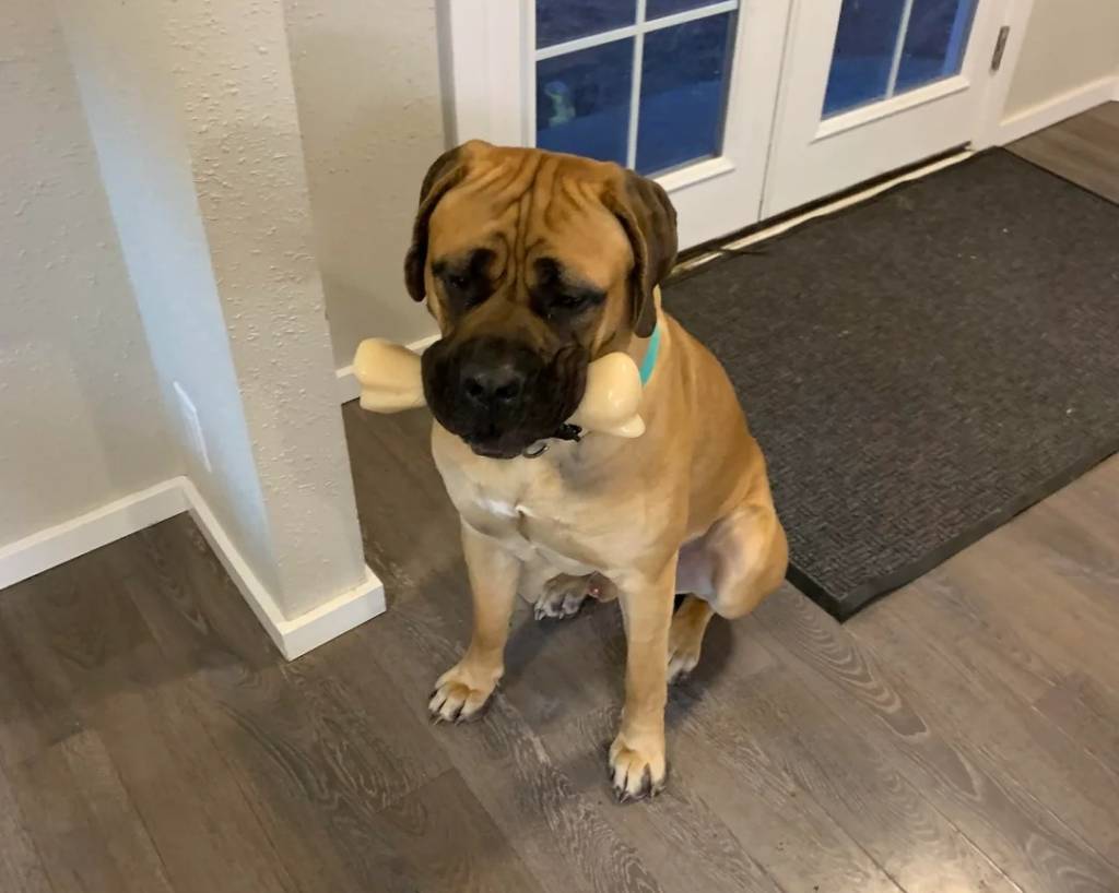 Un Boerboel assis sur un parquet et tenant un os dans sa gueule