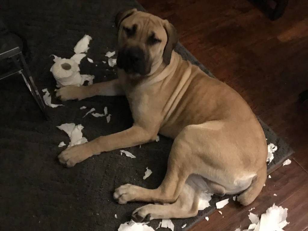 Un Boerboel allongé sur un tapis et ayant fait des dégâts