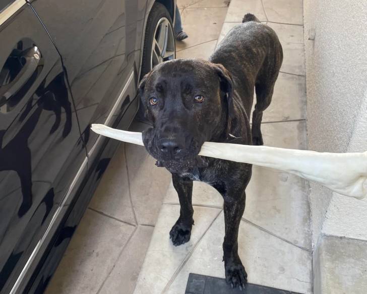 Un Boerboel à côté d'une voiture et tenant un os dans sa gueule