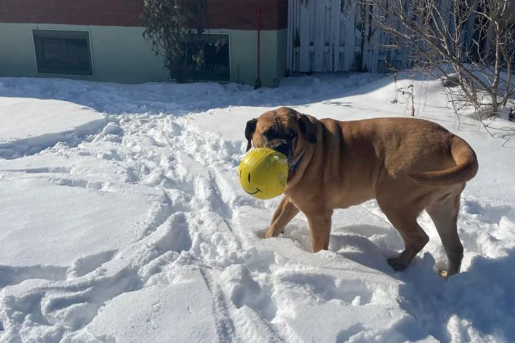 Un Boerboel marchant sur un terrain enneigée et tenant une balle dans sa gueule