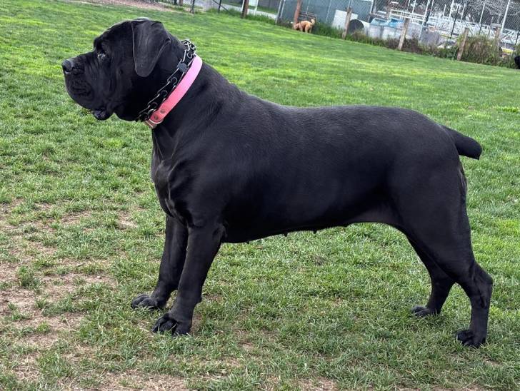 Un Boerboel sur un terrain herbeux portant un collier autour du cou