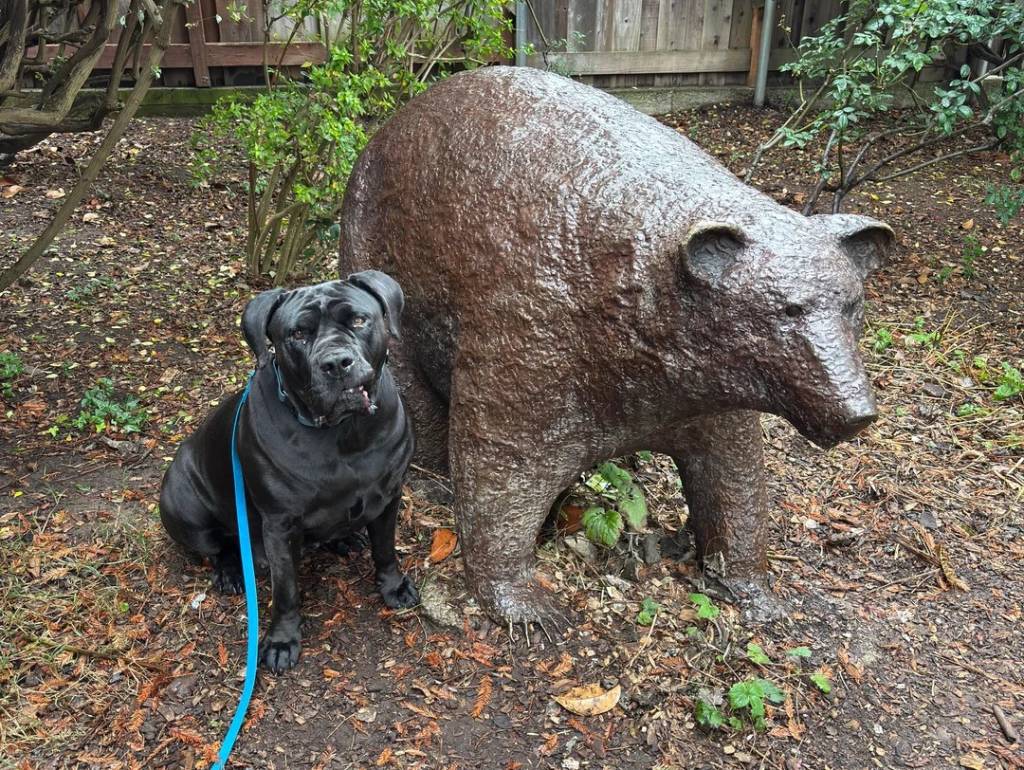Un Boerboel posant à côté d'une statut d'ours