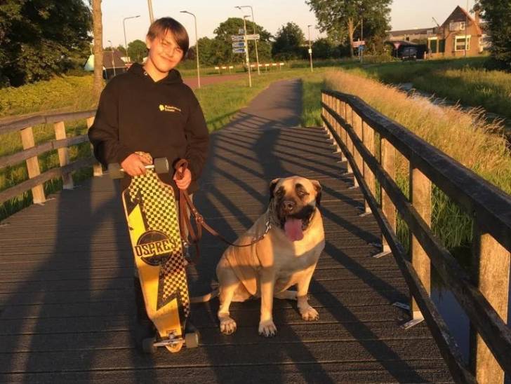 Un Boerboel assis sur un pont en bois à côté d'un jeune garçon