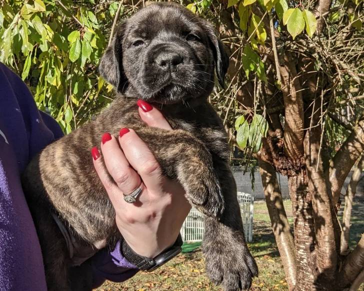 Un chiot Boerboel tenu dans la main d'une personne