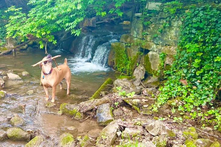 Un Boerboel tenant un petit bois non loin d'une chute d'eau