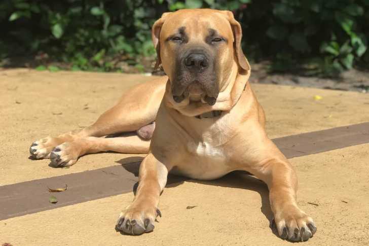 Un Boerboel allongé sur une surface sableuse et portant un collier autour du cou