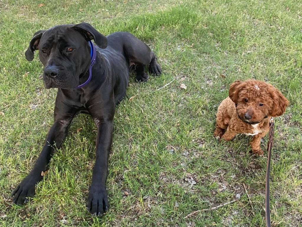 Un Boerboel allongé sur un terrain herbeux à côté d'un autre chien
