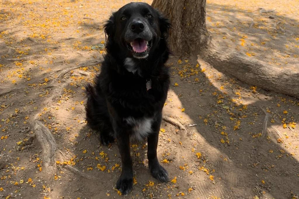 Un Borador assis au pied d'un arbre et portant un collier autour du cou