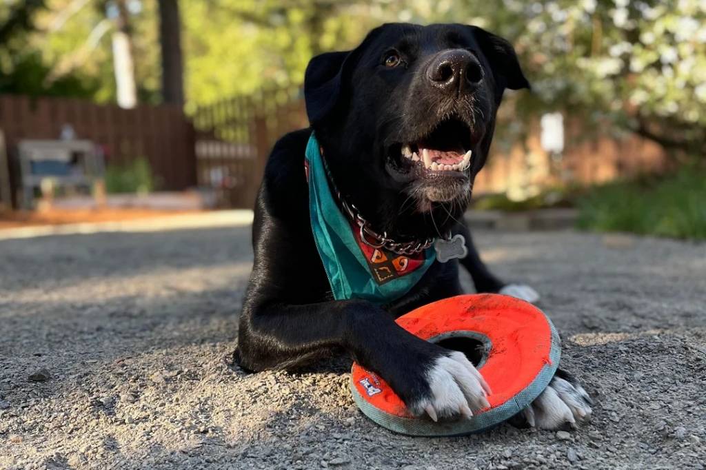 Un Borador allongé sur un sol en gravier et portant un collier autour du cou