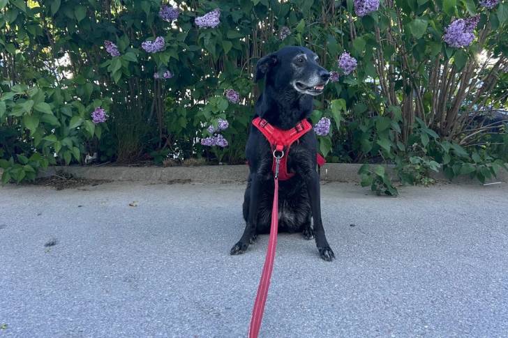 Un Borador assis sur une surface bétonnée et qui est tenu en laisse
