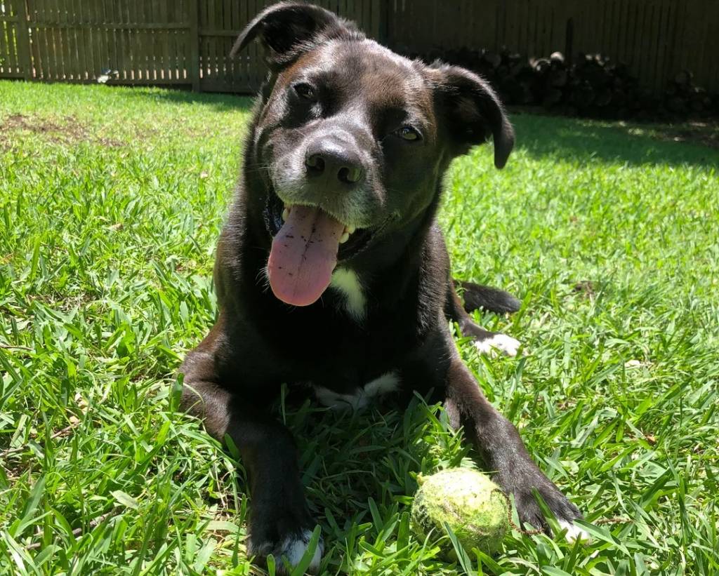 Un Borador allongé sur une surface gazonnée et ayant la langue pendante