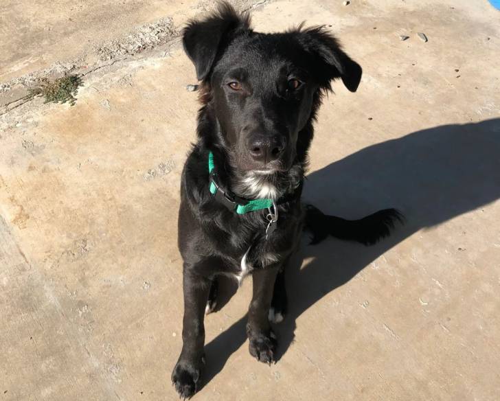 Un Borador assis sur une surface bétonnée et portant un collier autour du cou