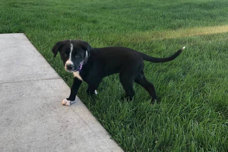 Un Borador marchant sur une surface gazonnée et portant un collier autour du cou