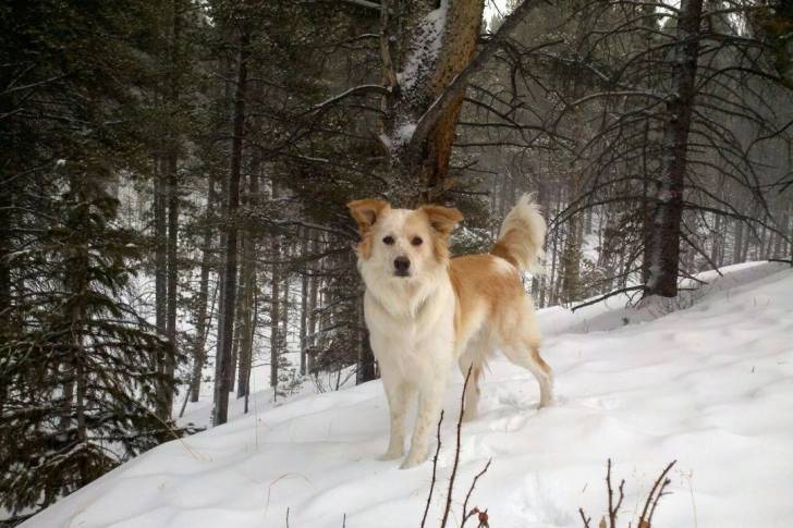 Un Border-Aussie sur une surface enneigée et regardant vers la caméra