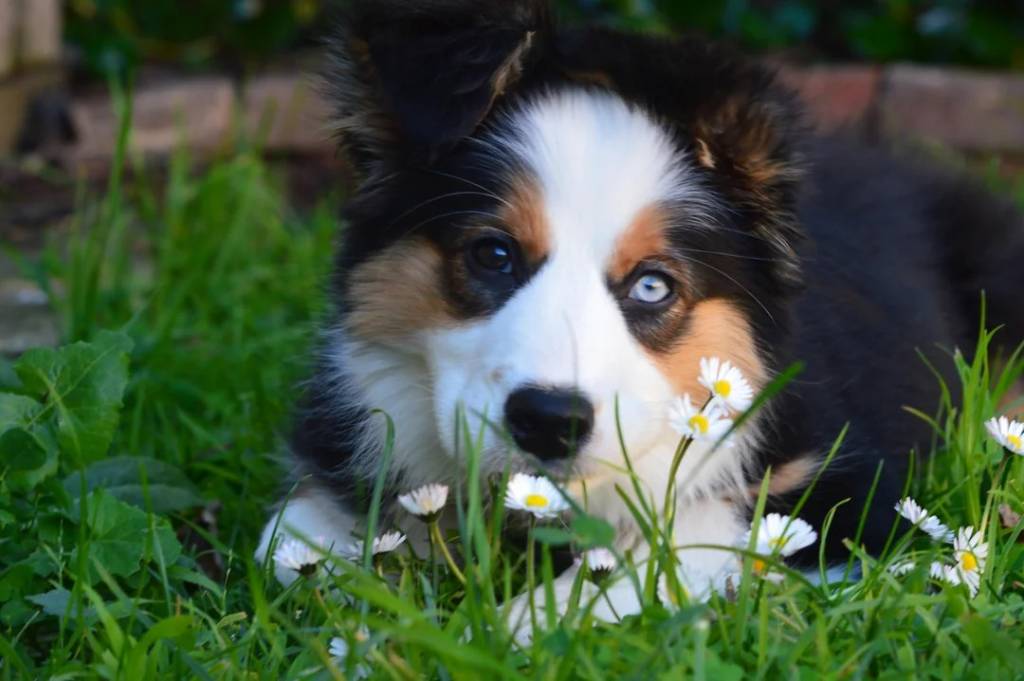 Un Border-Aussie se promène dans le jardin