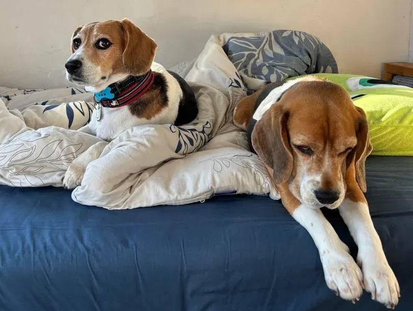 Deux Border Beagle allongés sur un lit et semblant détendus