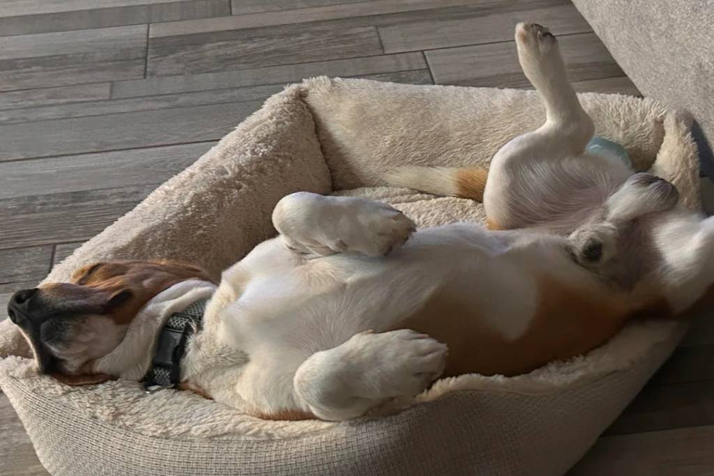 Un Border Beagle allongé sur le dos dans un panier et portant un collier autour du cou