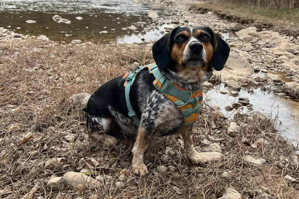 Un Border Beagle assis sur une surface herbacée et portant un harnais