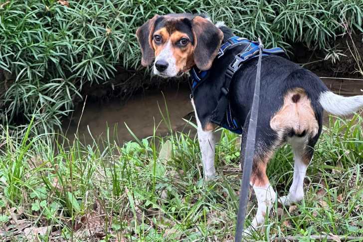 Un Border Beagle sur un terrain herbeux et qui est tenu en laisse