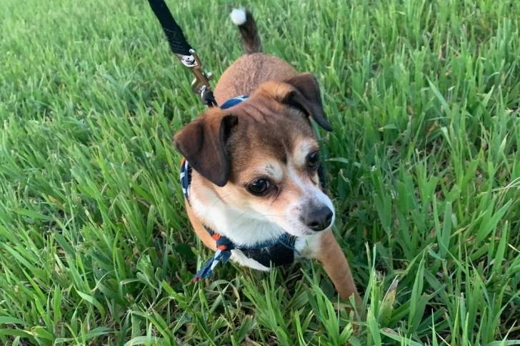 Un Border Beagle sur un terrain herbeux et qui est tenu en laisse