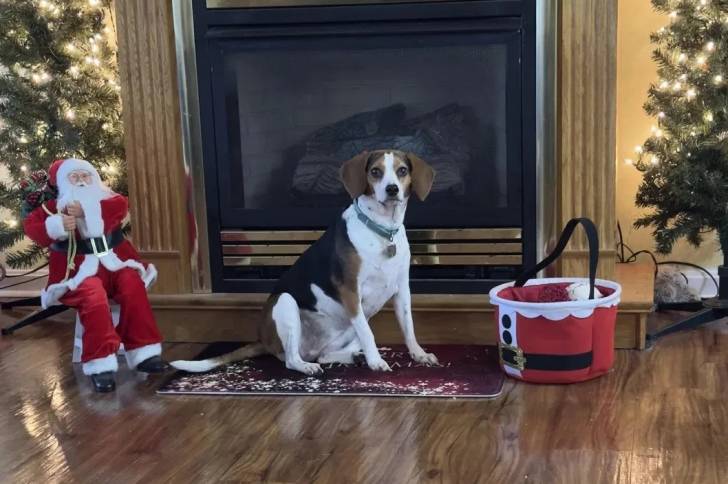 Un Border Beagle assis devant une cheminée et portant un collier autour du cou