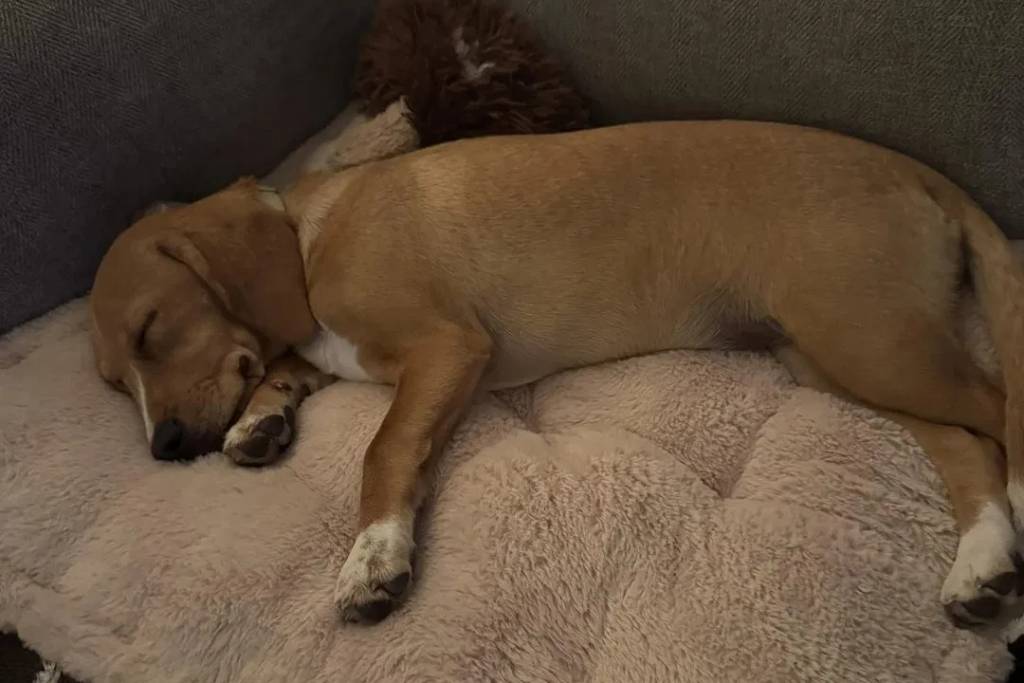 Un Border Beagle est intrigué par des personnes faisant du yoga