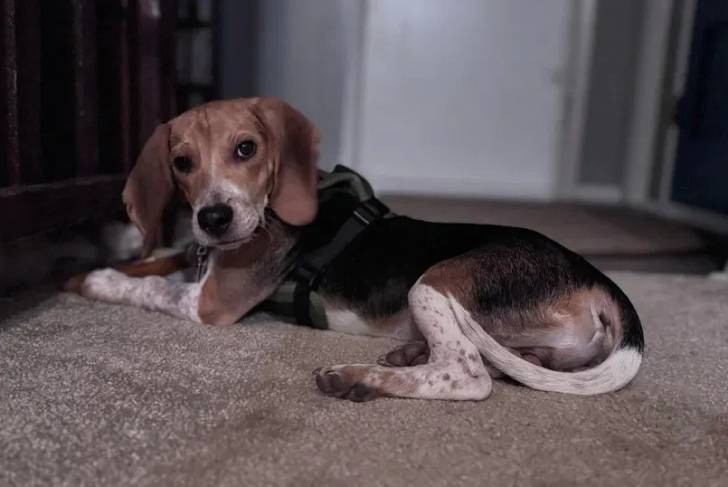Un Border Beagle allongé sur une moquette et portant un harnais