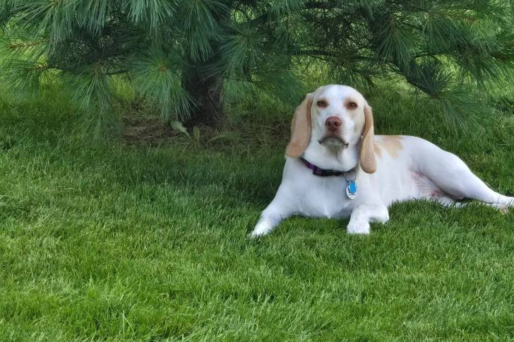 Un Border Beagle allongé sur un terrain herbeux et portant un collier autour du cou