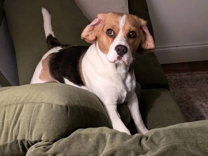 Un Border Beagle est intrigué par des personnes faisant du yoga