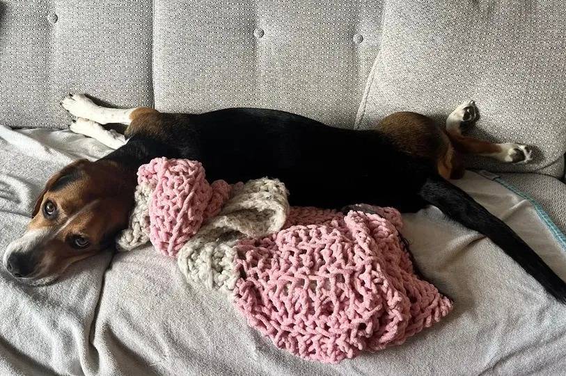 Un Border Beagle est intrigué par des personnes faisant du yoga