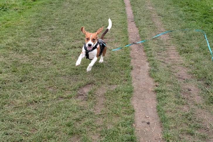 Un Border Beagle est intrigué par des personnes faisant du yoga