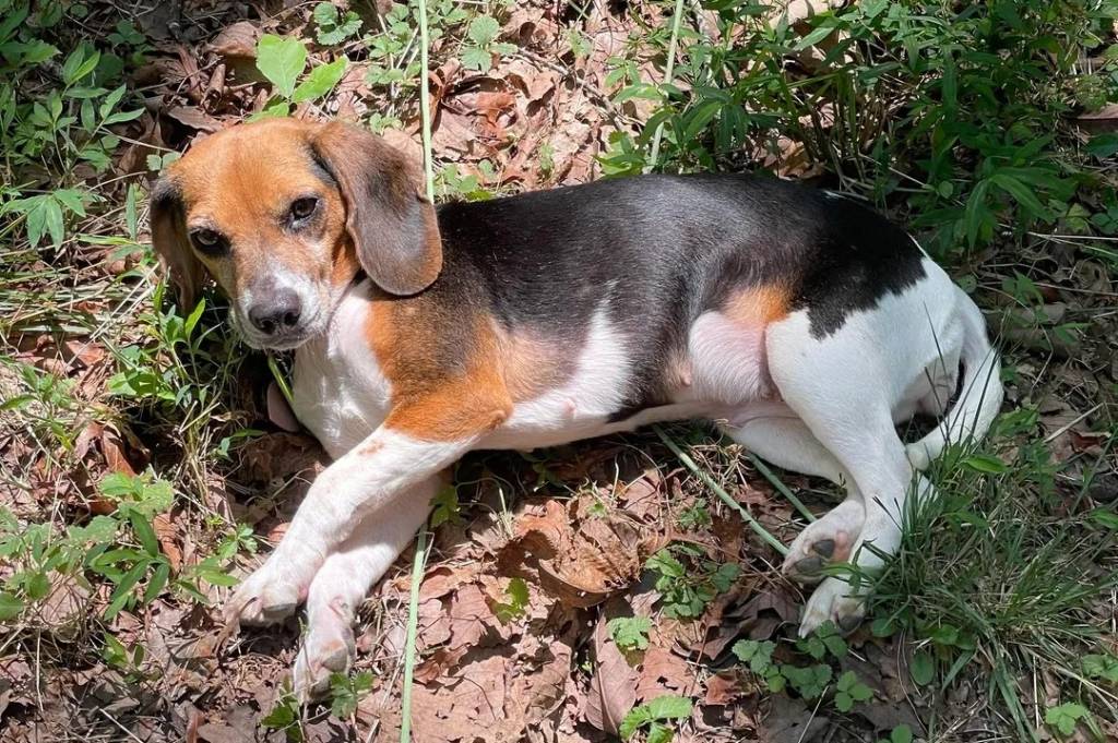 Un Border Beagle allongé sur un terrain herbeux et regardant vers la caméra
