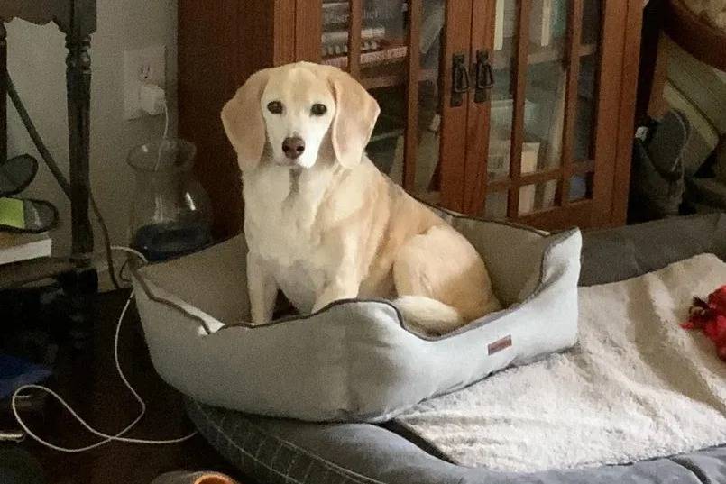 Un Border Beagle assis dans un panier et regardant vers la caméra