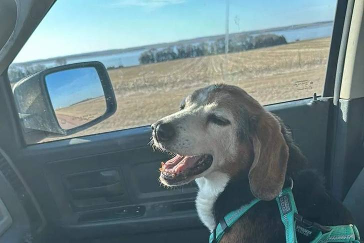 Un Border Beagle assis sur le siège d'une voiture et portant un harnais