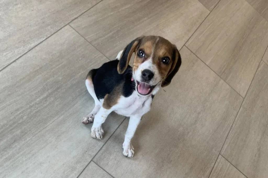 Un Border Beagle est intrigué par des personnes faisant du yoga