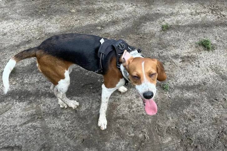 Un Border Beagle est intrigué par des personnes faisant du yoga