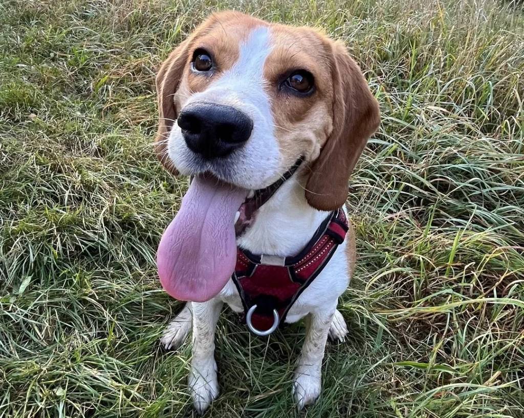 Un Border Beagle est intrigué par des personnes faisant du yoga