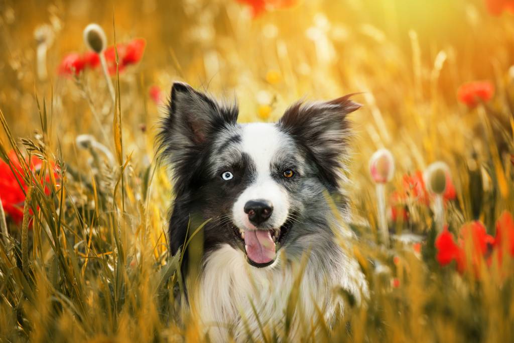 Un Border Collie au pelage merle assis dans un champ de coquelicots