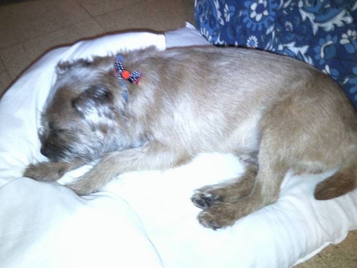 Un Border Terrier hilare pendant son sommeil