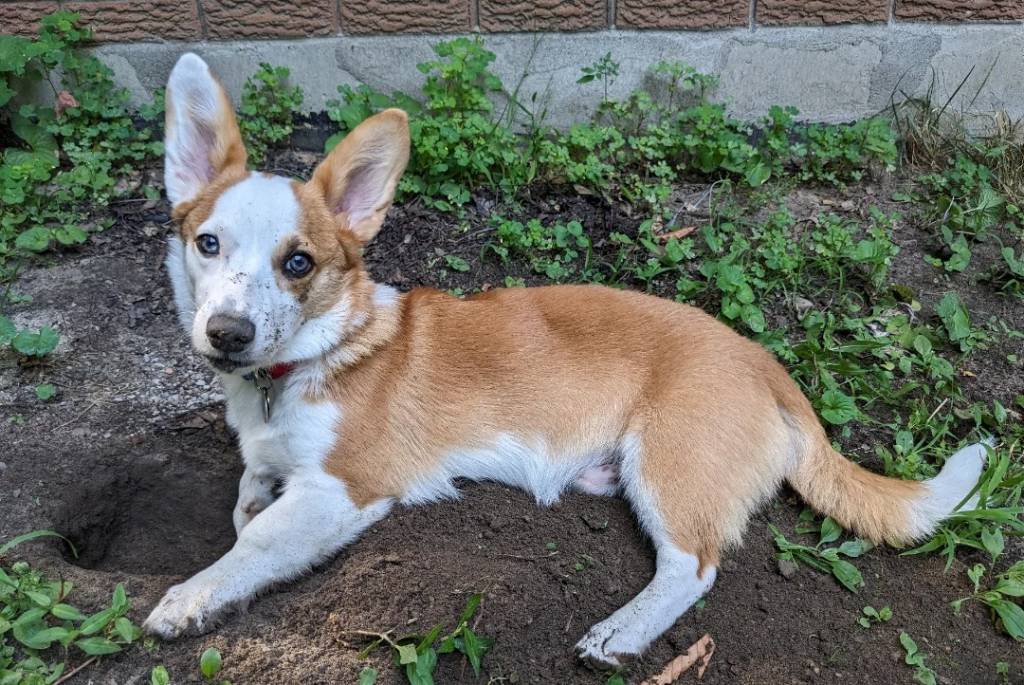 Un Borgi allongé sur une surface sableuse et portant un collier autour du cou