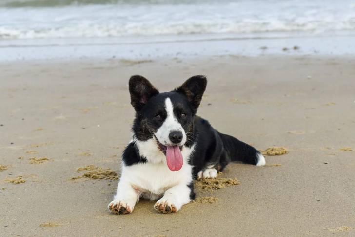 Un Borgi allongé sur une surface sableuse et ayant la langue pendante