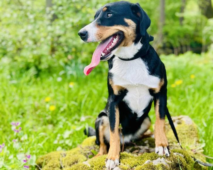 Un Bouvier d’Appenzell sur un terrain herbeux et ayant la langue pendante