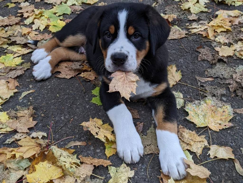 Un Bouvier d’Appenzell allongé sur un sol jonché de feuilles mortes et ayant une feuille dans sa gueule