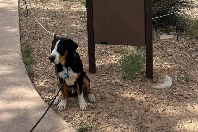 Un Bouvier d’Appenzell assis sur une surface sableuse et qui est tenu en laisse