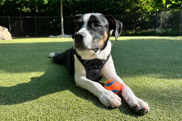 Un Bouvier d'Appenzell allongé sur du gazon synthétique et portant un harnais