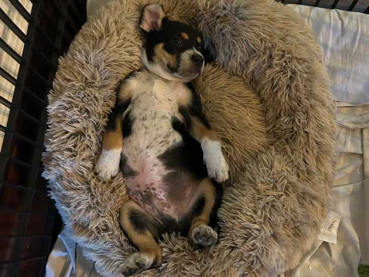 Un Bouvier d’Appenzell allongé dans un panier