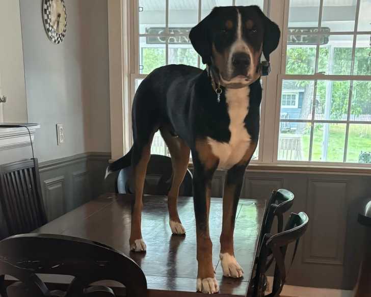 Un Bouvier d’Appenzell sur une table et portant un collier autour du cou
